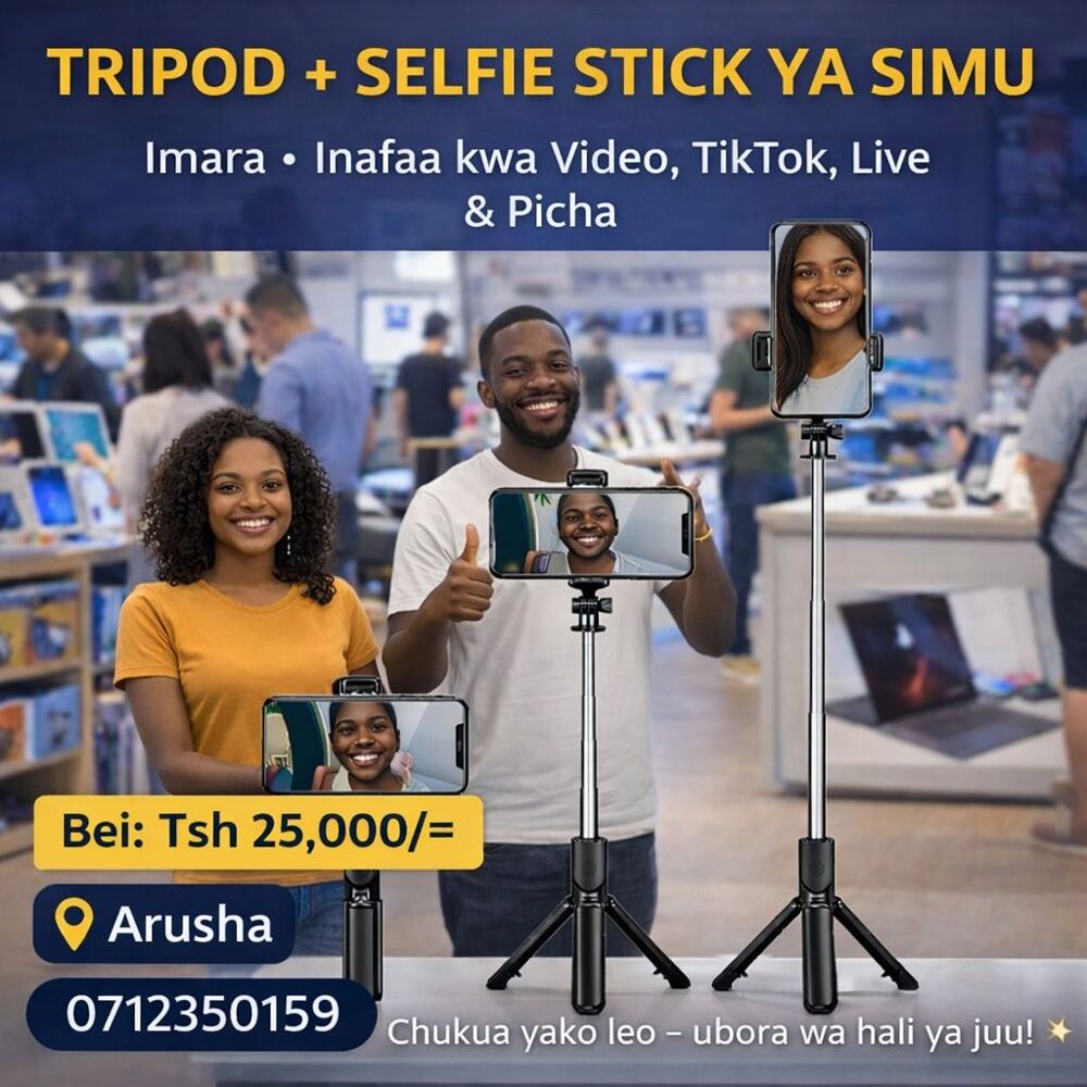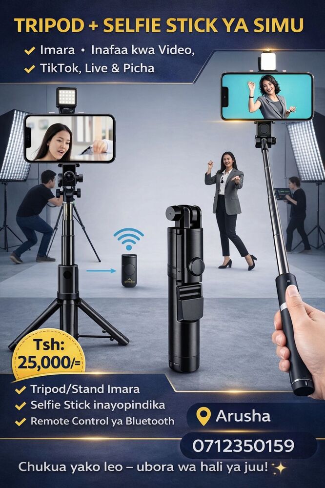 TRIPOD + SELFIE STICK YA SIMU ๐ธ Selfie Stick nzuri na imara ๐ฅ Mahubiri โข Live Video โข Video Meeting ๐ฌ TikTok & Content Creators ๐ฎ Remote ya Bluetooth ๐ฐ Tsh 25,000/= ๐ Arusha ๐ 0712350159