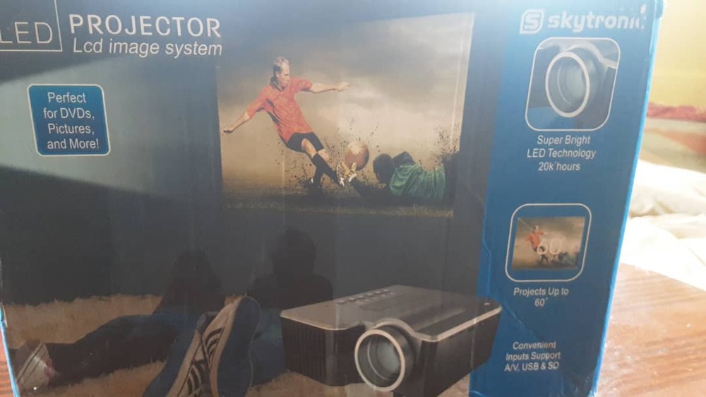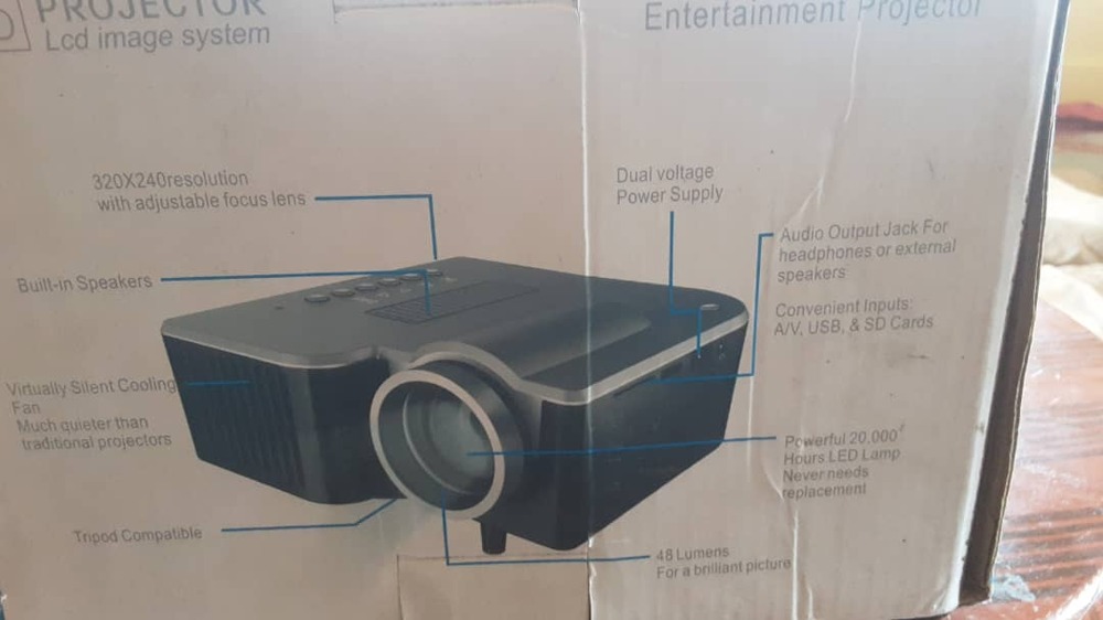 PROJECTOR, LCD image system Perfect for DVDs,Pictures, and more. convenient input support A/V, USB & SD. Technical specification input 110-240v, 50/60hz Dimensions 5"*4.75"*2.3" Projection distance: 1-4 meters Image size: 20-100 inches Audio: Stereo input Lighting : LED rcsolution: 320*240 Brightness : 48 lumens