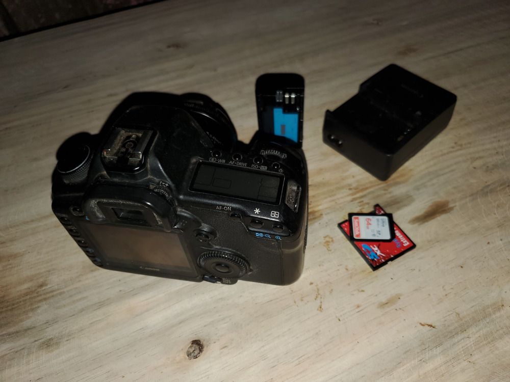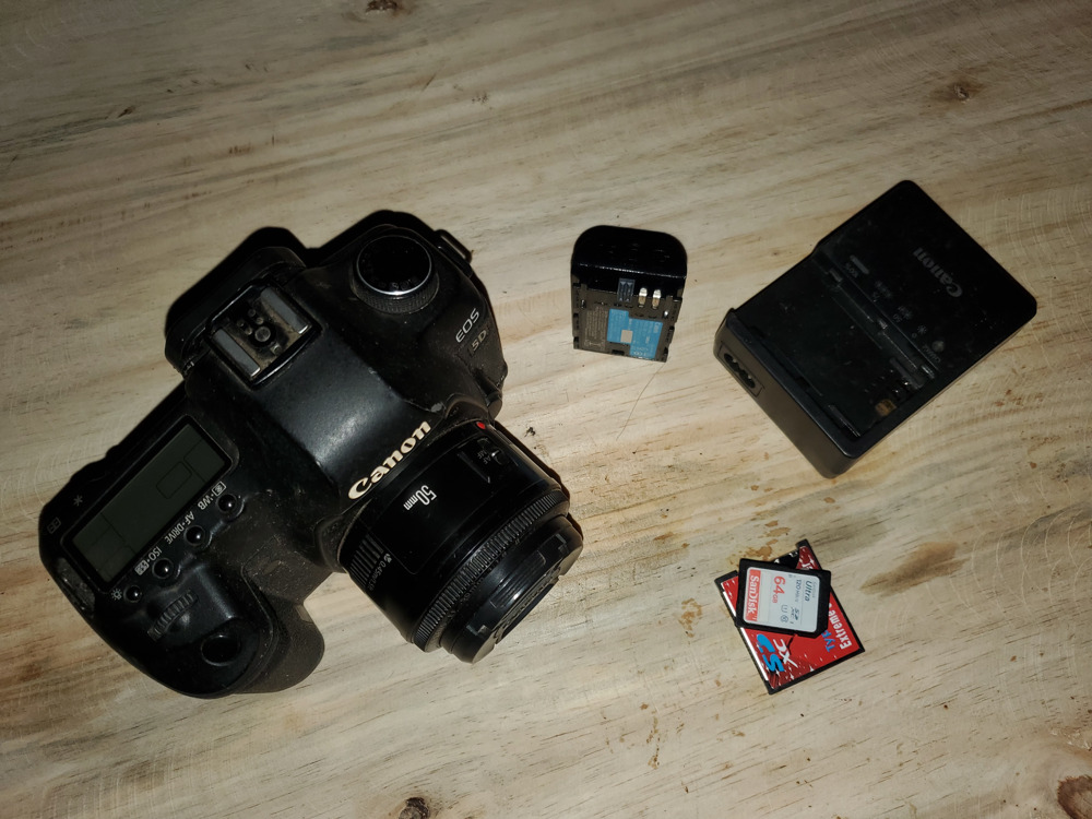 Full frame DSLR camera with a 50mm EF lens, a single battery with charger and a 64GB SD Card with its adapter.