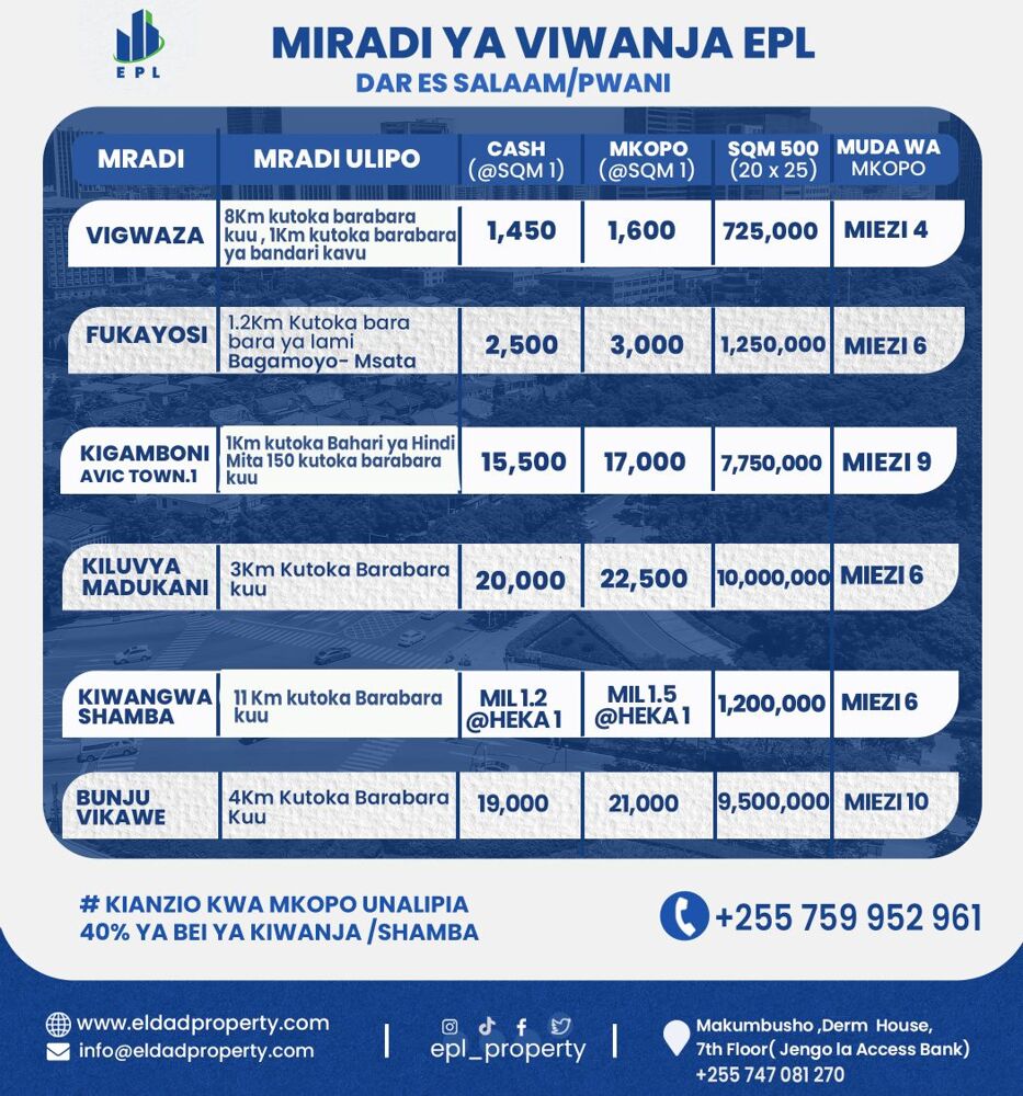 Eldad property limited inakukaribisha kwenye miradi ya viwanja na mashamba kwa bei nafuu mnoo. Na unaweza kulipia kwa cash au kwa mkopo. piga 0759952961 tuweze kupanga ratiba ya kukupeleka kuangalia site.