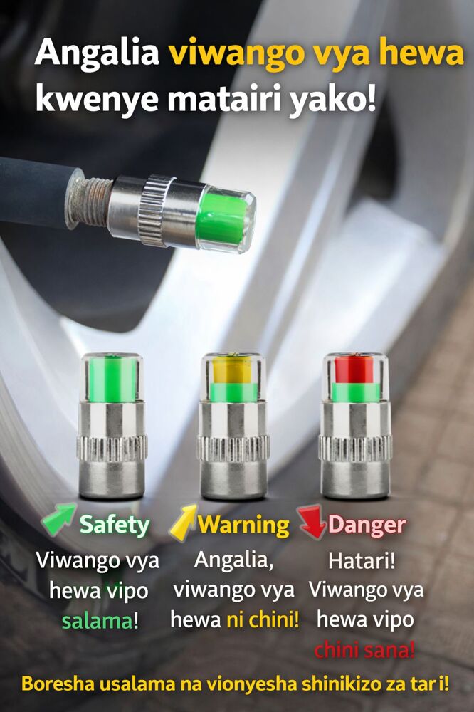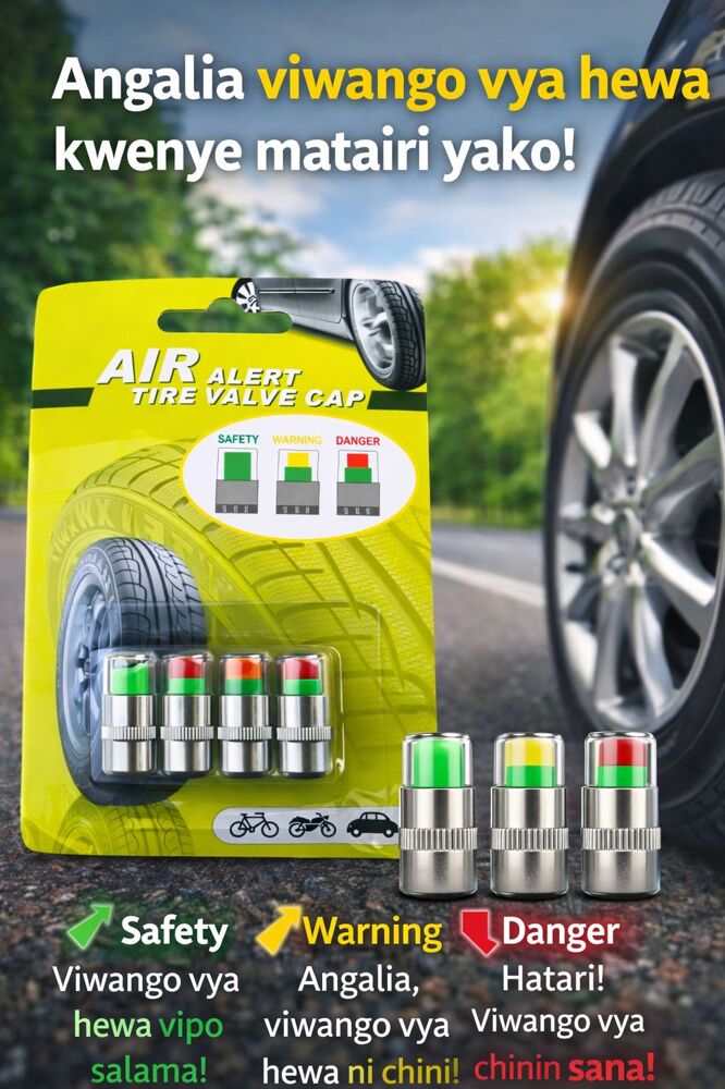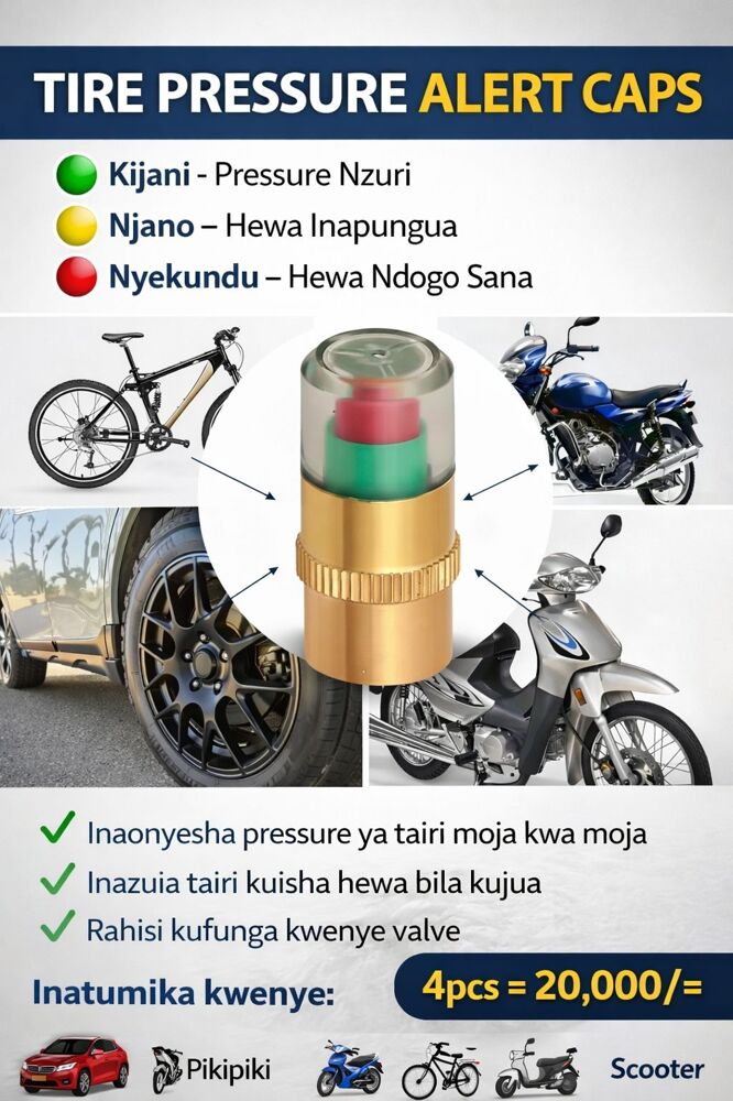 ๐ AIR ALERT TIRE VALVE CAP Angalia presha ya tairi lako kwa urahisi bila kifaa maalum! ๐ข Kijani โ Presha ya tairi iko sawa ๐ก Njano โ Presha inapungua ๐ด Nyekundu โ Presha ndogo, ongeza hewa Inafaa kwa: ๐ Magari ๐ Pikipiki ๐ฒ Baiskeli ๐ต Scooter ๐ฐ Bei: 1pc = 6,000/= 4pcs = 20,000/= ๐ 0712350159 ๐ Arusha Town